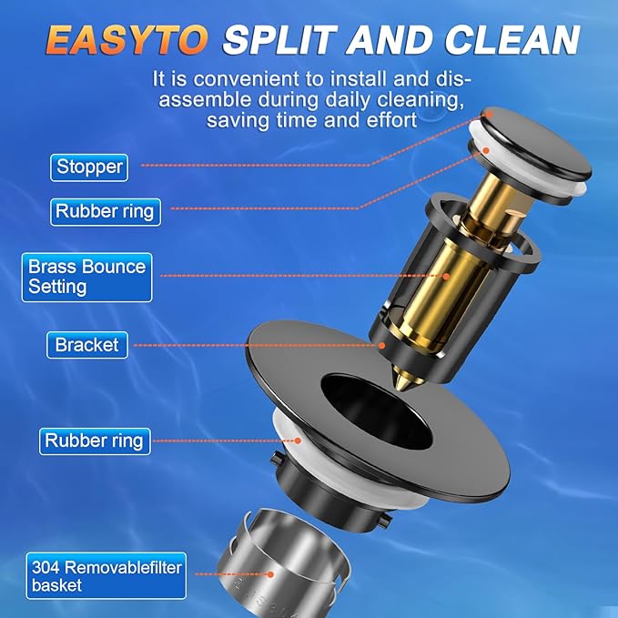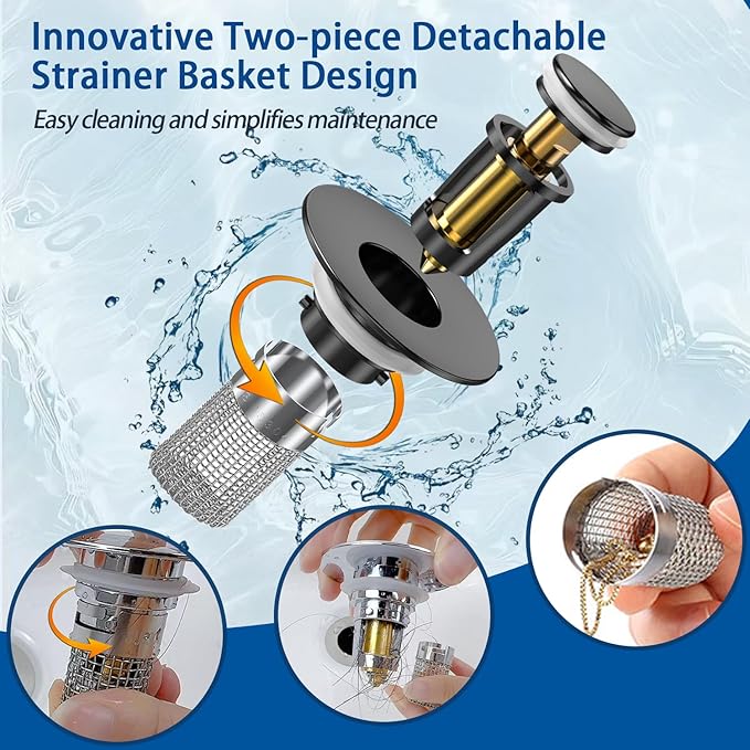 • šŸ”„ć€Pop-up Design怑This bathroom sink drain strainer is engineered to catch hair and prevent clogs in your bathroom sink. The sink stopper features an easy-to-use pop-up mechanism that makes it easy and convenient to open and close the drain. With a diameter range of 1.1-1.45 inches, it fits most American bathroom sink stopper and is an effective drain strainer. The brass core construction ensures durability and long-lasting performance, making it a great choice for all bathroom sinks.